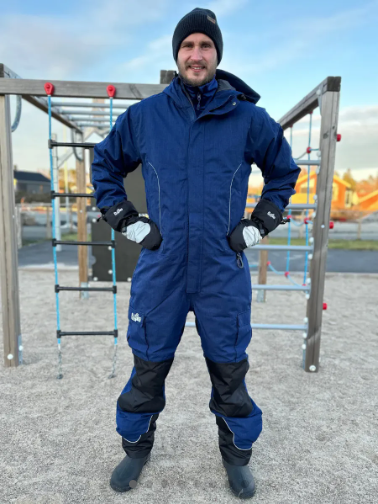 Hoppindressen Blå til herre er en fóret og vattert kjeledress, utviklet i samarbeid med barnehageansatte. Dressen er både vindtett og vanntett, og har mange justeringsmuligeter for å kunne sitte godt på akkurat deg. God kvalitet, gjennomført design og smarte detaljer kjennetegner Hoppindressen, som også er myk og komfortabel å bevege seg i. Perfekt når man er ute og i aktivitet med barn på de kalde årstidene.